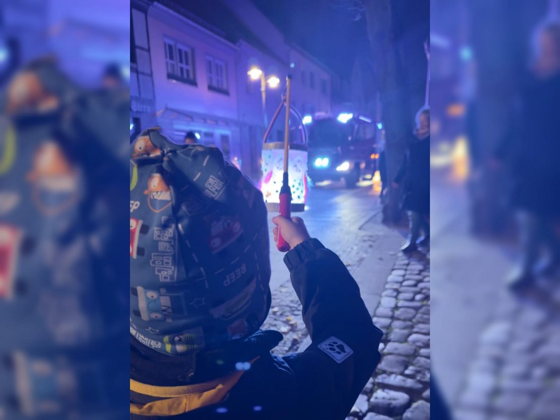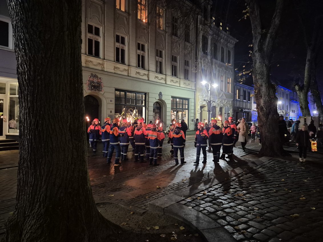Im Anschluss wurden süße Hörnchen geteilt, und mit den selbst gebastelten Laternen zogen wir – begleitet von der Jugendfeuerwehr Ueckermünde – durch die abendliche Stadt. Auf dem Kirchplatz erwarteten uns anschließend warme Würstchen, Kinderpunsch und Zitronentee.